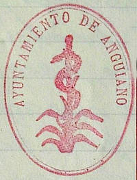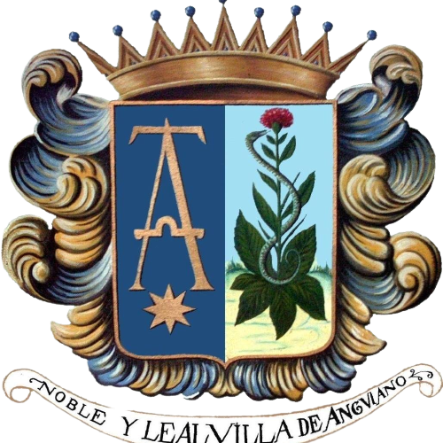 Encontramos la referencia más antigua al escudo de Anguiano en un inventario documental del archivo municipal del S. XIX, donde se describe el privilegio que Carlos II otorga al pueblo de Anguiano en 1695, cuando certifica su liberación del yugo señorial. Se indica, entre otros aspectos, que el documento se compone “de veinte y seis fojas útiles, escritas en pergamino, guarnecidas todo alrededor de una cenefa hecha de pluma y en la primera, arriba, el sello de las armas reales y por bajo d´él, las armas de esta villa, pintadas de colores, con un letrero bajo ellas que dice: Noble y leal villa de Anguiano”.