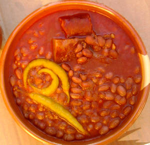 Verter el refrito sobre las alubias, seguir moviendo un ratito la cazuela siempre cociendo a fuego lento. Retirar del fuego y dejar reposar.